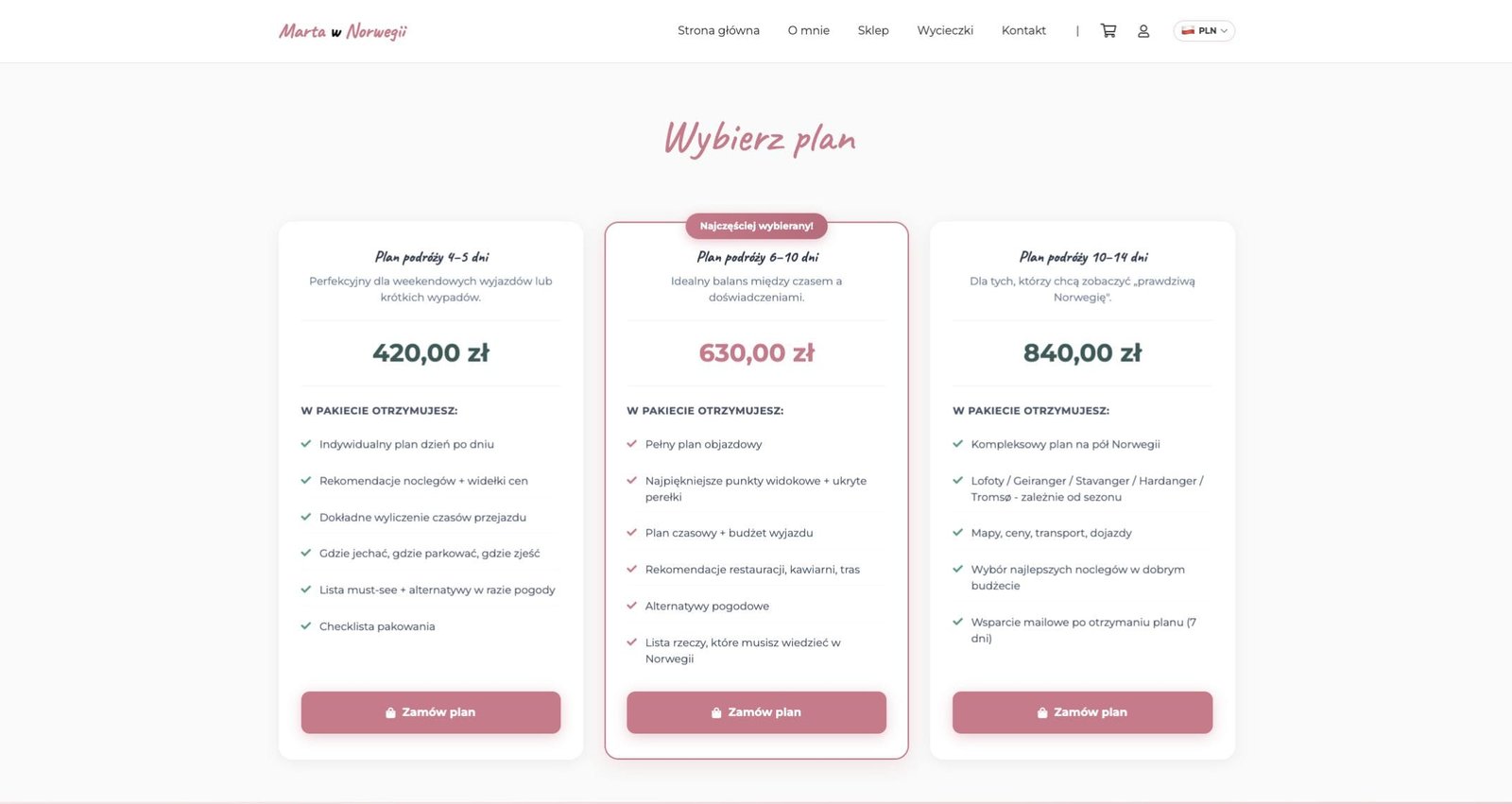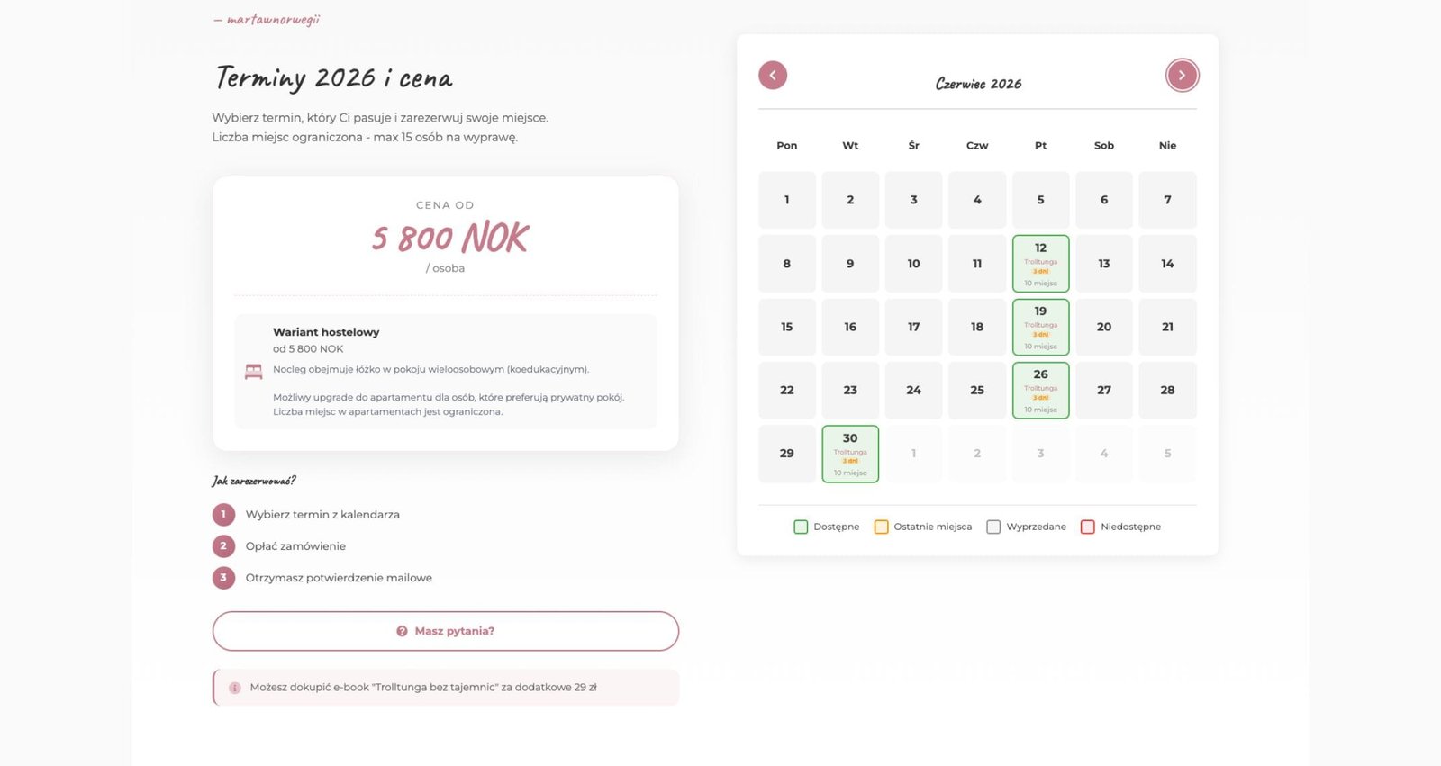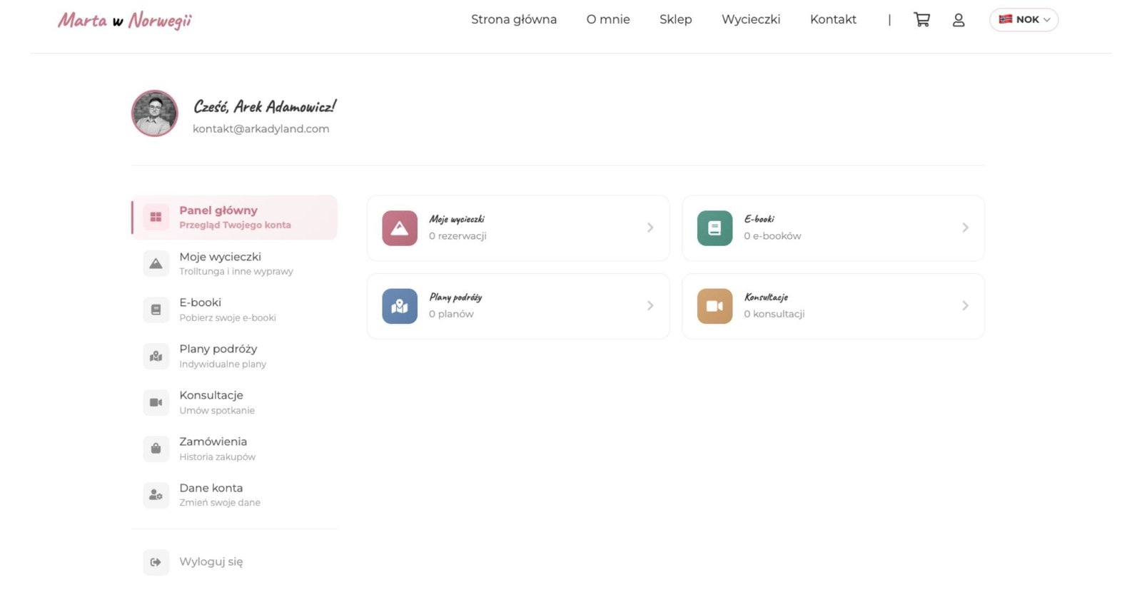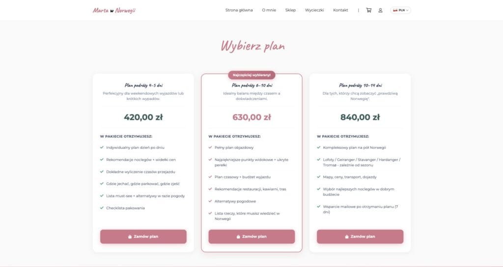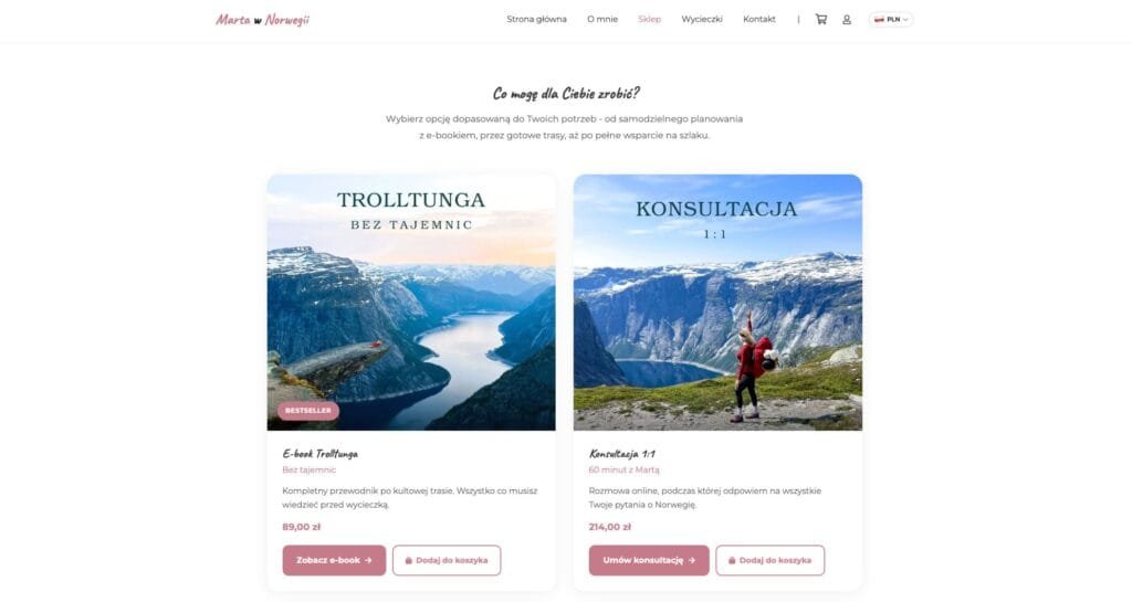 Marta Sadowa to popularna twórczyni internetowa (@polka_w_norwegii na TikToku), organizatorka wycieczek na Trolltungę i autorka e-booka. Potrzebowała kompleksowej strony, która połączy sklep z rezerwacjami wycieczek, sprzedaż produktów cyfrowych i budowanie marki osobistej.