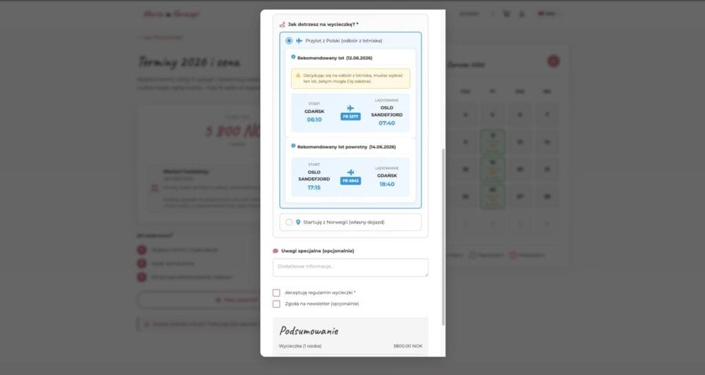 - Dedykowana wtyczka kalendarza rezerwacji z formularzem dopasowanym do klienta — m.in. rekomendacje lotów i wybór wyposażenia